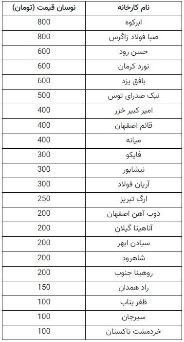 طبق جدول فوق بیشتر رشد مربوط به کارخانه ابرکوه و صبا فولاد زاگرس است. این دو کارخانه  با رشد ۸۰۰ تومانی قیمت میلگرد، بالاترین نوسانی قیمتی در بخش میلگرد را به خود اختصاص دادند.