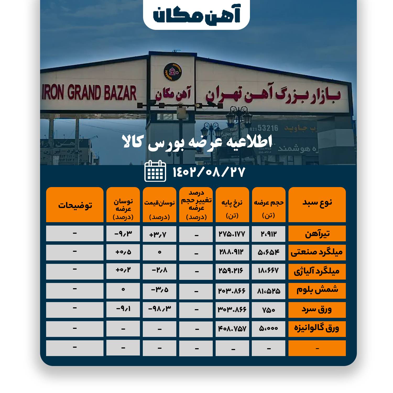 به گزارش آهنمکان؛ طبق جدیدترین اطلاعیه عرضه بورس کالای ایران امروز ۲۷ آبان ۱۴۰۲ قرار است یک میلیون و ۵۰۰ هزار و ۳۰۸ تن محصول شامل ۱۱۴ هزار و ۵۰۸ تن محصولات نورد فولادی، یک میلیون و ۲۸۳ هزار و ۸۰۰ تن محصولات سنگ آهنی و ۱۰۲ هزار تن آهن اسفنجی در تالار صنعتی عرضه شود. این مقدار عرضه نسبت به هفته قبل ۱۲ درصد کاهش در حجم عرضه دارد.